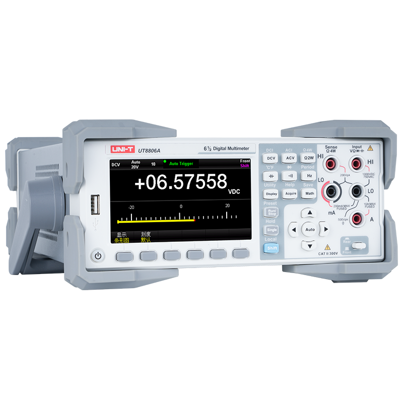 UT8806A 6½位双显示数字万用表,拥有出众的读数速率和精确度,是为满足客户多功能,高精度,自动测量要求而设计的一款产品。除基本测量外,还有各种数学运算功能和更加人性化设计。
